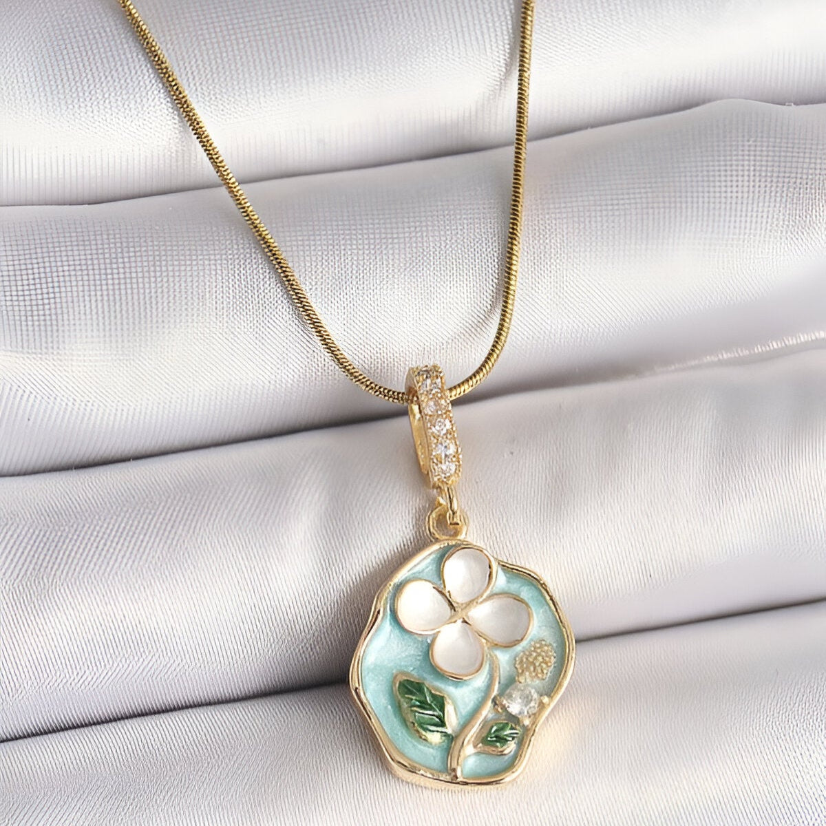 Bring charm and serenity to your look with our Blossom Glow Floral Pendant Necklace. This exquisite piece features a soft aqua enamel background with a delicately crafted white flower and green leaf detailing, evoking nature’s calm elegance.