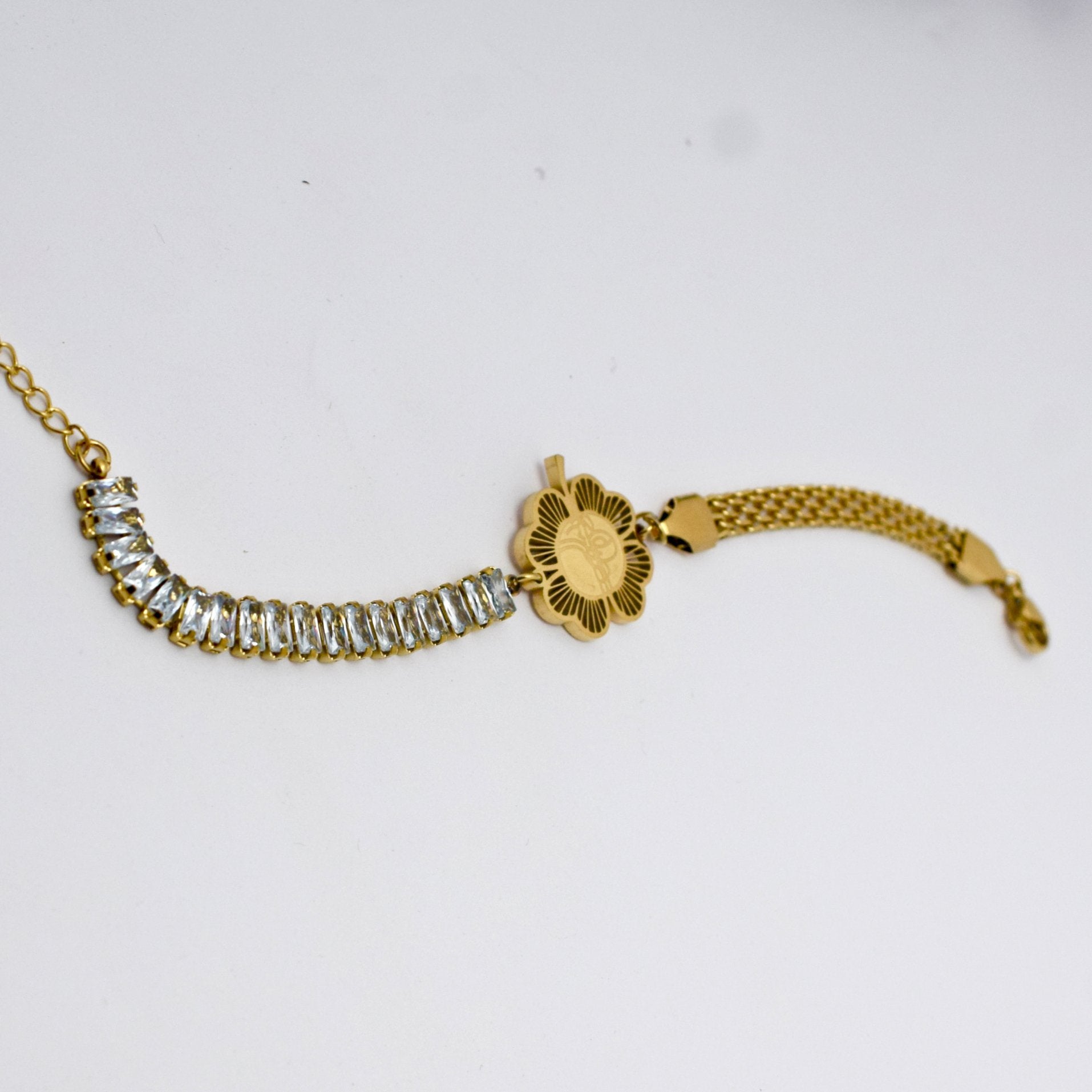 levate your jewelry collection with this elegant gold-plated bracelet, featuring a striking combination of sparkling rectangular crystal stones and a delicately engraved daisy flower charm at the center. The bracelet blends sophistication and charm with a unique mix of a fine-link chain and a mesh band, making it a standout accessory for both casual and formal looks.