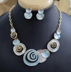 Make a bold fashion statement with this contemporary necklace and earring set, featuring a unique blend of spiral motifs and textured circular elements in metallic hues. The centerpiece of the necklace showcases an artistic swirl pattern with subtle blue and silver tones, adding a creative flair to your outfit. The matching stud earrings complete the look with a chic and cohesive touch.