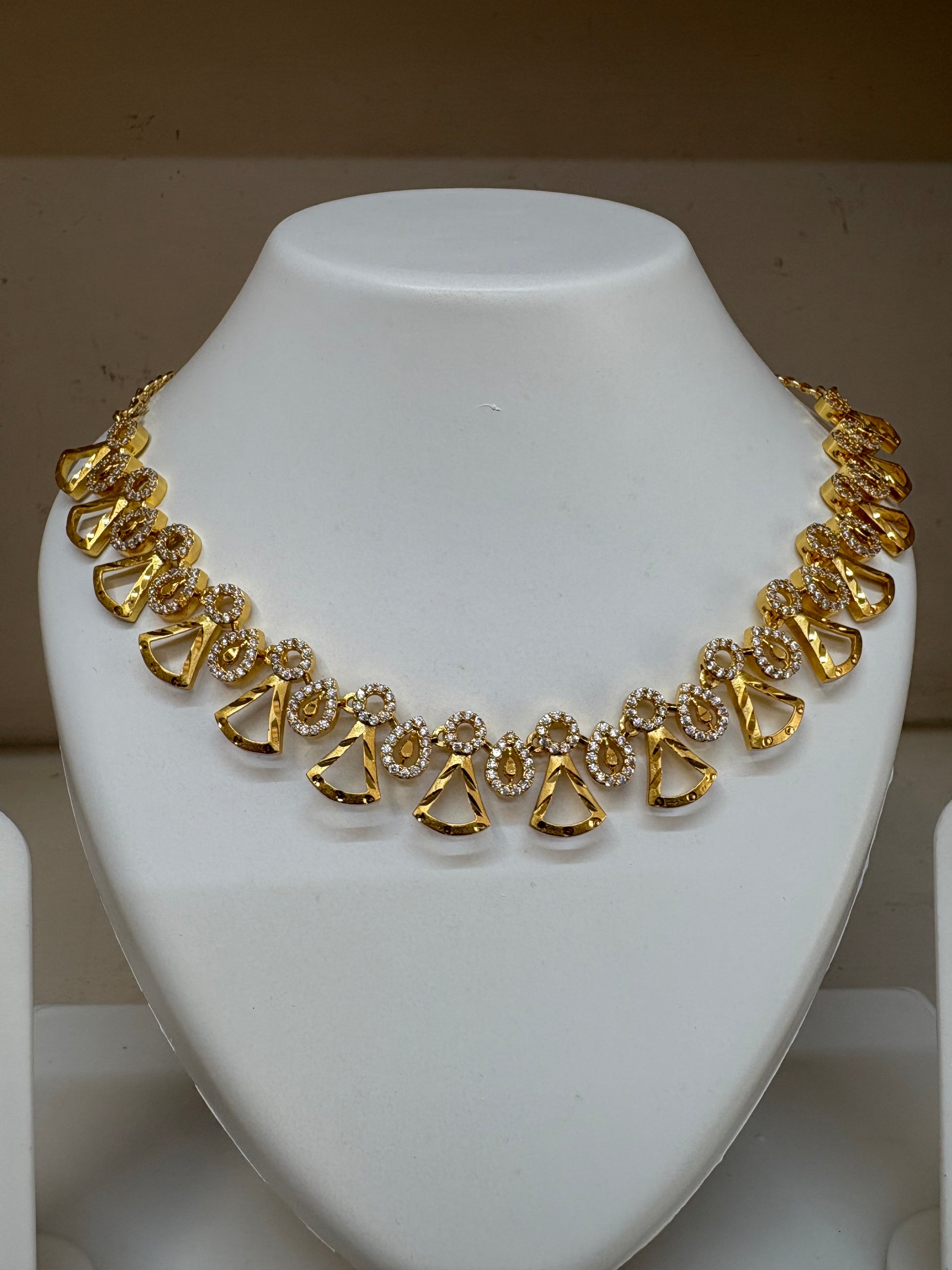 Elevate your festive charm with this elegant one gram gold plated necklace set featuring a unique diamond-studded triangle design. Each delicate triangle link is beautifully crafted to reflect luxury and sophistication, while the matching earrings add a perfect finishing touch. Designed for women who adore minimal yet classy jewellery, this set blends traditional artistry with a modern edge.